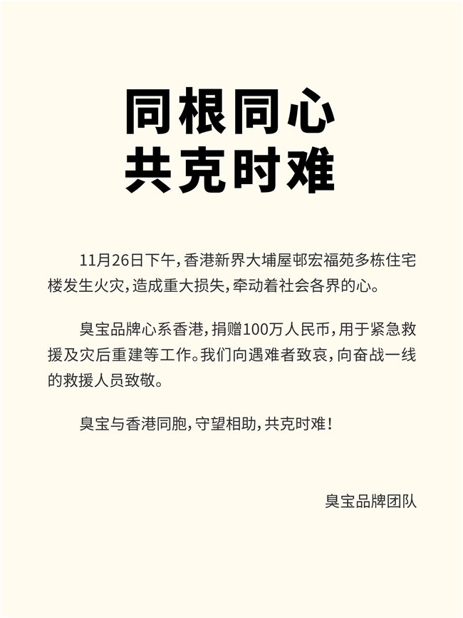 臭宝品牌宣布捐赠100万元人民币驰援香港,用于受灾群众的照顾看护、应急阶段的生活补助以及灾后老旧社区的减防灾能力提升等各项工作,并向遇难者致哀,向奋战一线的救援人员致敬。
